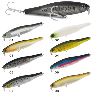 Pencil bait affondante, disponibile nelle misure di 80 e 95 mm. Grazie al particolare bilanciamento dei pesi interni, presenta un movimento side-to-side appena sotto la superficie dell’acqua e un wobbling molto accentuato durante le pause. Il rapporto